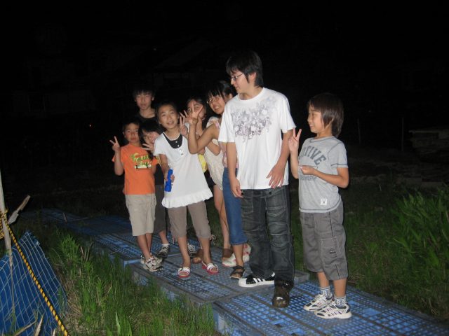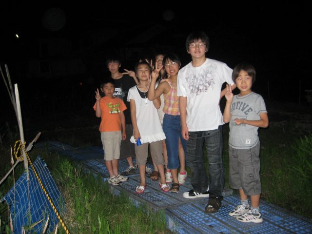 | このメンバーでワイワイ歩くのは久し振り。田んぼに行くと、次から次へホタルを手に見せに来る。♀が多い。平家が多い。これが平家、これが源氏と見せていると、中学生の舞が、「あ、そうか。平家とあの源氏ぃ?今初めて知った」という。聞き慣れた名前に実は因縁があったと気付くことはよくあること。 |
