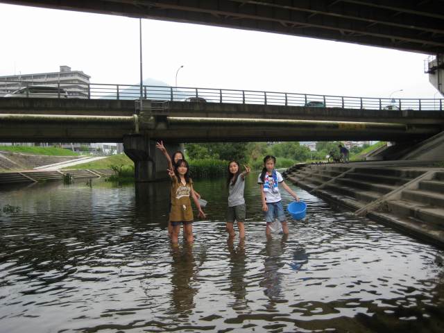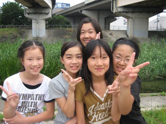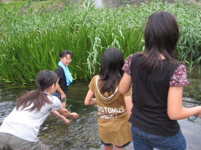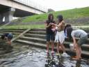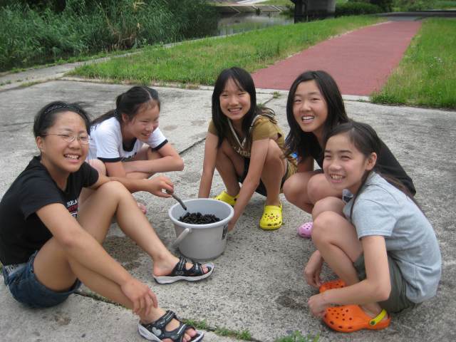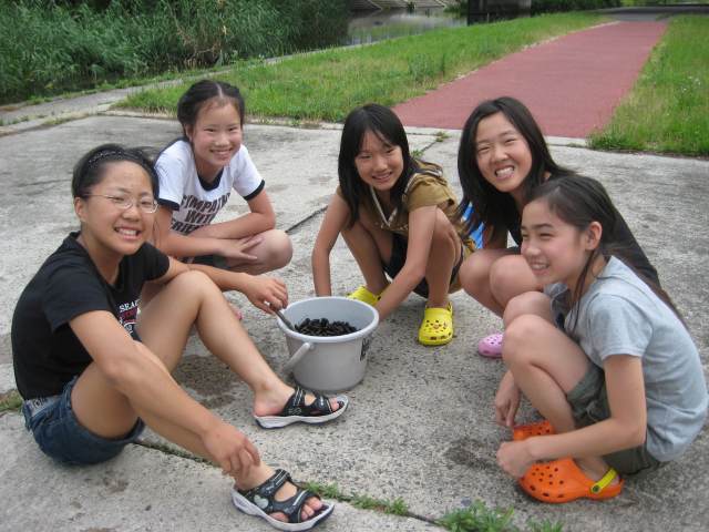 バケツ1杯のカワニナの前で「イチニ イチニ」と言って全員笑顔写真 |